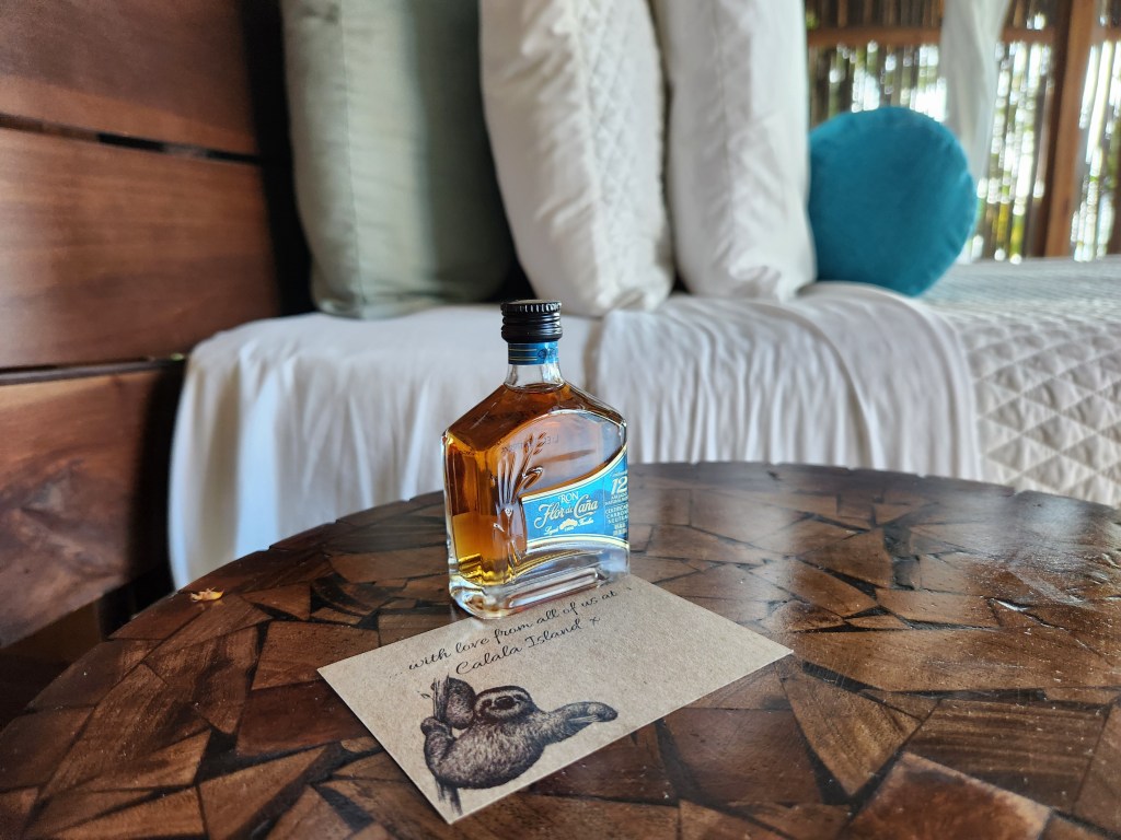 Although Calala is luxurious in many ways, be aware that the rooms are somewhat similar to “glamping”. There’s no air conditioning, but there are two large ceiling fans that keep the air moving. We slept with both sets of french doors wide open all night and loved the breeze and sound of the ocean. You’ll find little geckos in the room and there are a few bugs, but no mosquitoes! We loved the indoor/outdoor feel of the room, but it might not be everyone’s idea of luxury. They also leave you a gift every night, like a bottle of rum or a little wooden turtle. It’s a really nice touch.