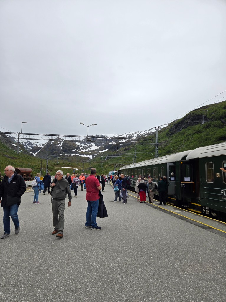You ride through Flåm up 867 meters to the mountaintop Myrdal train station. Along the way, you stop at Kjosfossen waterfall for a little photo-op and some entertainment…I won’t ruin the surprise…but it’s pretty amusing. From their website: “The 20-km long railway line is one of the steepest standard gauge lines in the world, with 80% of the journey running on a gradient of 5.5%. There are no less than 20 tunnels, 18 of which were built by hand. One of the tunnels even takes a 180 degree turn inside the mountain.” The kids each received a coloring book from the train attendants, which was a really nice gesture. There’s nothing to do in Myrdal, so just hop right back on the train and head back to Flåm. I believe one of the stops has an epic Zipline adventure, but we didn’t participate in that activity this time around.