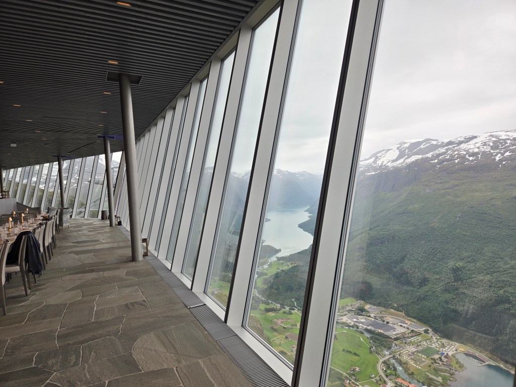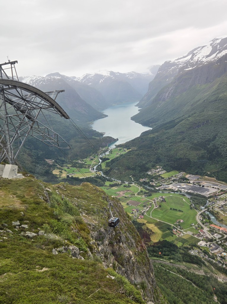 The town of Loen is just south of Stryn and offers some great views of Nordfjord. There’s a “lift” (or gondola) in Loen that takes you to the top of the mountains with views, the Hoven Restaurant, and hiking at the top. At this point in the trip, my husband nearly died at the $65 per adult and $33 per kid price of admission here. Honestly, we’d seen so many lovely Fjord views at this point in our trip, that I’m not sure the Loen Skylift was worth it. The Hoven restaurant was…fine. We’re talking $30 burgers, but an amazing view. I dunno. We did some hiking here in the pouring rain. They also have ziplining and base jumping, but we did neither. I’m torn on whether to recommend this spot or not.