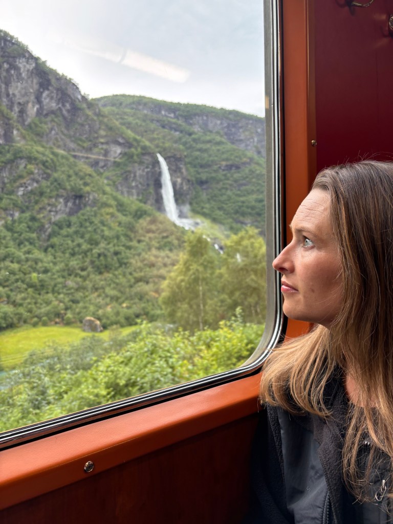 Heralded as the “most beautiful train journey in the world”, the Flåmsbana offers a round trip voyage from Flåm to Myrdal and back again. Two adults and two kids cost us about $250 for the 2-hour round trip ride. Definitely book tickets in advance, as this is also a popular cruise ship excursion. The internet informed me that we should sit on the right side of the train for optimal views, although I don’t think you can go wrong with any seat. I would suggest that you get in line 20 minutes or so before departure.