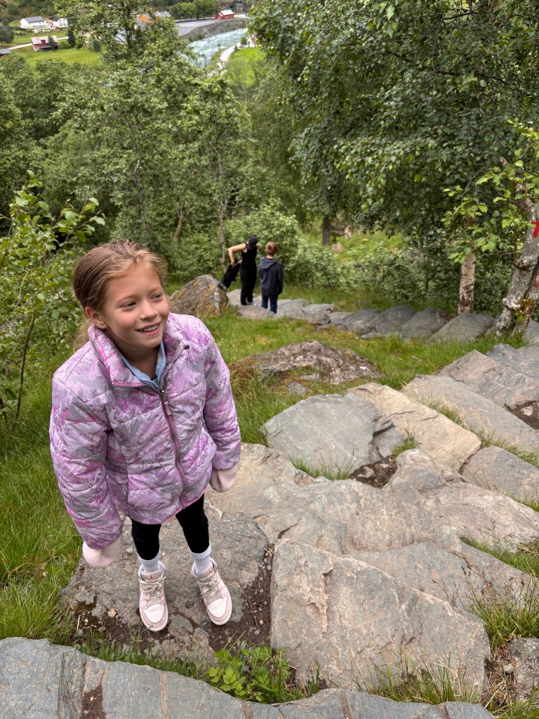 - Brekkefossen – I hope you’ve been on the stair master recently…beautiful waterfall views, but over 500 steps to the top. We did do this hike, and it was worth the literal pain in the booty. Great views of Flåm too. Even though there were a lot of stairs, I think a lot of kids would be capable of this hike as well…as long as you bring snacks! FYI – All of the hikes in Norway were clearly marked as green, blue or red so you know the difficulty before you venture out.